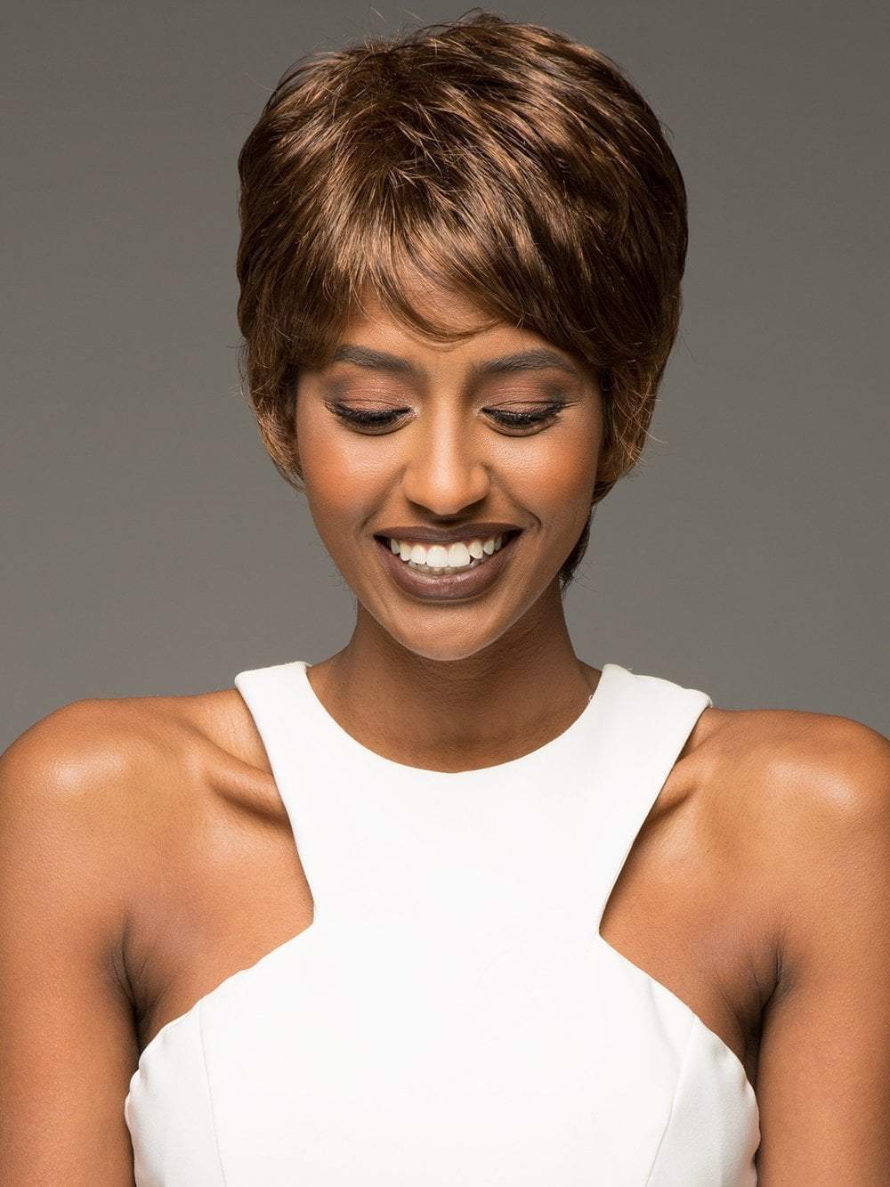 The Amy Wig by Vivica Fox is a stunning short wavy shag with a short back and nape featuring a pure stretch cap construction. Beautiful short wig for women of color, also available in color Black.